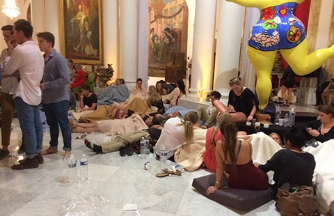 Nhiều người tạm lánh nạn tại một phòng khách sạn sang trọng ở Nice đêm 14-7-2016.
