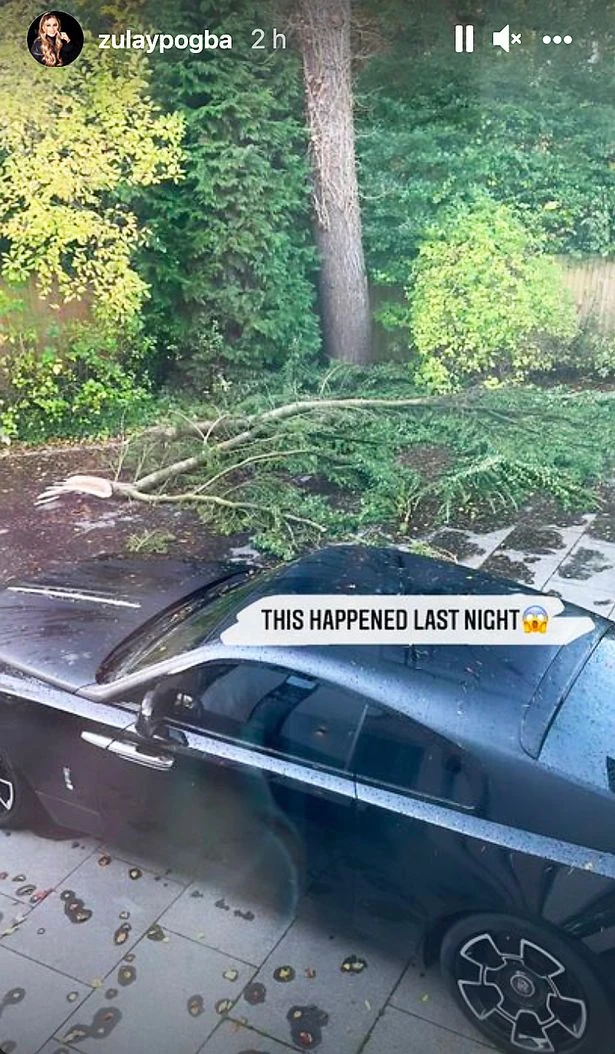 Pogba thậm chí còn gặp vận may khi né được nhánh cây đổ ập xuống khi chiếc xe Rolls Royce của anh đang bon bon chạy trên đường. Vợ của Pogba, Maria Zulay Salaues đã chia sẻ lên mạng xã hội Instagram bức ảnh chiếc xe Rolls Royce dừng cách cái nhánh cây đổ không xa.