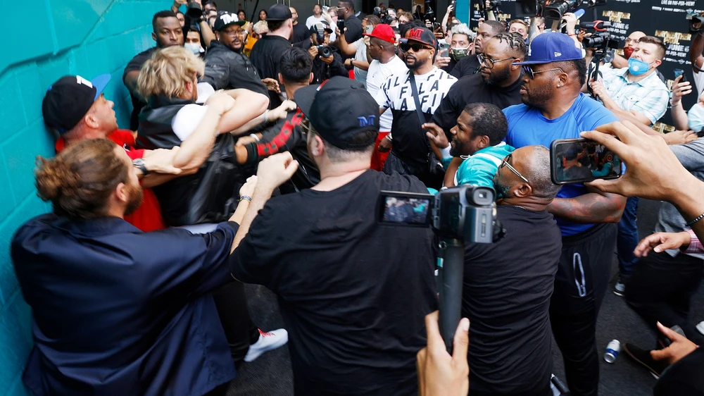 Cuộc họp báo giữa hai tay đấm Floyd Mayweather và Logan Paul trở thành một vụ ẩu đả loạn xạ khi cả hai trả lời phỏng vấn truyền hình.