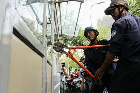 Nhân viên Dịch vụ công ích quận 1 đang phá cửa trụ sở khu phố 6 để dọn đồ ra trước khi phá bỏ