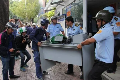 Lực lượng trật tự đô thị đang dọn đồ đạc bên trong trụ sở ra ngoài để phá dỡ