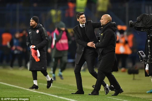 Pep Guardiola chúc mừng HLV Paulo Fonseca của Shakhtar Donetsk.