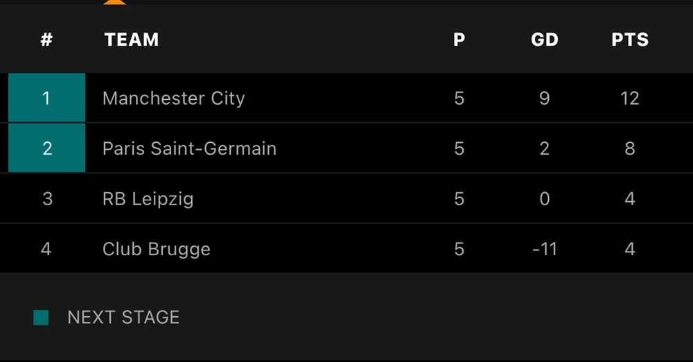 Ở cặp đấu còn lại của bảng A, Leipzig đánh bại Club Brugge với tỷ số 5-0 để có được 4 điểm sau 5 lượt trận. Hiện tại PSG đang có 8 điểm và cùng Man City đi tiếp ở Champions League.