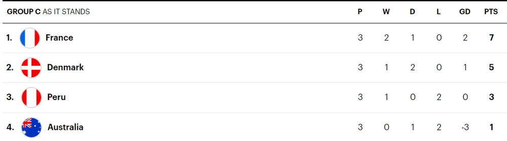 Bảng xếp hạng bảng C World Cup 2018: