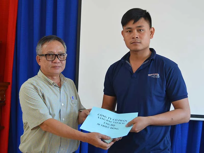 Ông Trương Văn Minh, Phó Tổng Giám đốc Công ty CP Xăng dầu Vitaco, đại diện chủ tàu Petrolimex 14 (trái), trao phần tiền hỗ trợ gia đình cho thuyền viên bị nạn. Ảnh: TRÙNG KHÁNH