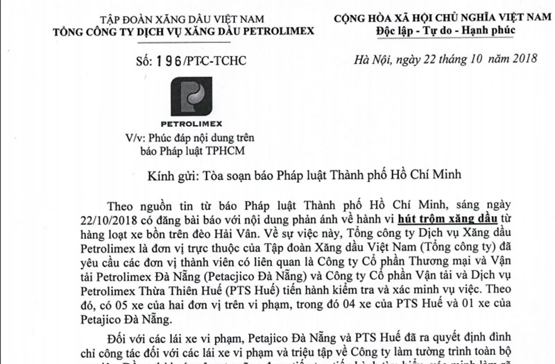 Chiều 22-10, Tổng Công ty Dịch vụ Xăng dầu Petrolimex, đơn vị trực thuộc Tập đoàn Xăng dầu Việt Nam (Petrolimex) đã có công văn phúc đáp thông tin "Rút ruột xăng dầu xuyên đèo" trên báo Pháp Luật TP.HCM số ra ngày 22-10.