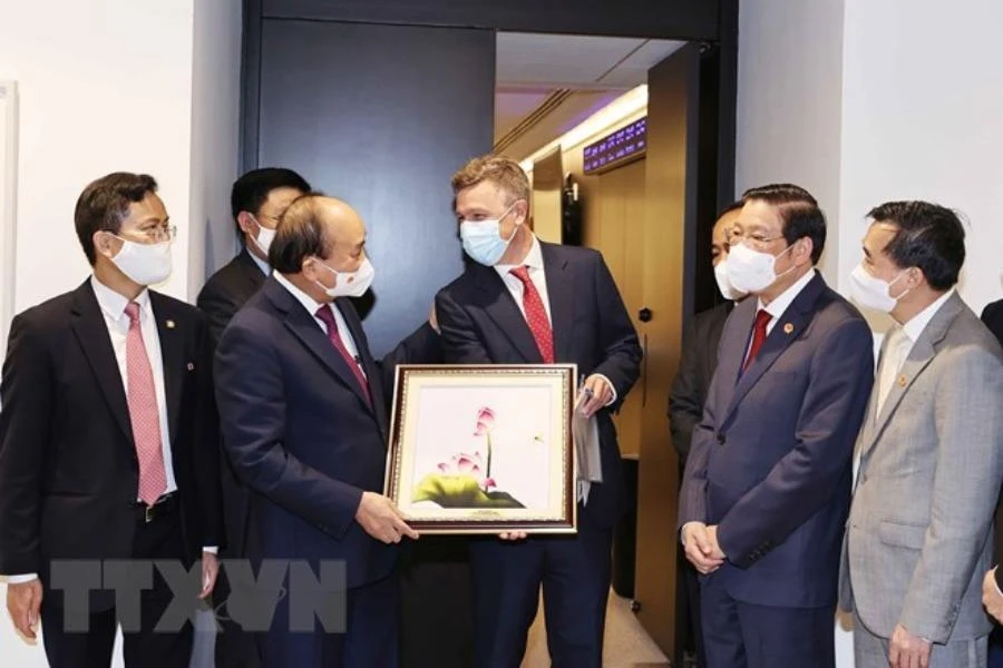 Chủ tịch nước Nguyễn Xuân Phúc trong chuyến thăm công ty Pfizer. Ảnh: TTXVN