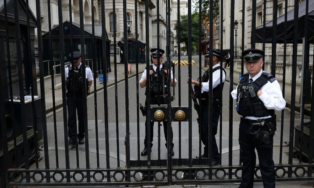 Cảnh sát vũ trang Anh canh gác tại cổng phố Downing, khu nhà chính phủ có nơi ở của nữ Thủ tướng Theresa May. Ảnh: AFP