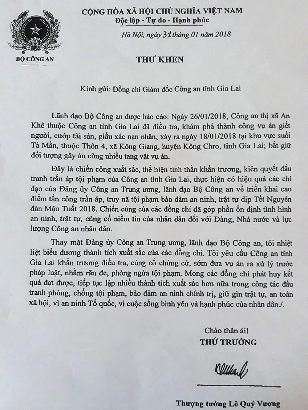 Trong thư, Thượng tướng Lê Quý Vương viết: Đây là chiến công xuất sắc, thể hiện tinh thần khẩn trương, kiên quyết đấu tranh trấn áp tội phạm của Công an tỉnh Gia Lai, thực hiện có hiệu quả các chỉ đạo của Đảng ủy Công an Trung ương, lãnh đạo Bộ Công an về triển khai cao điểm tấn công trấn áp, truy nã tội phạm, đảm bảo an ninh trật tự dịp Tết nguyên đán Mậu Tuất 2018.