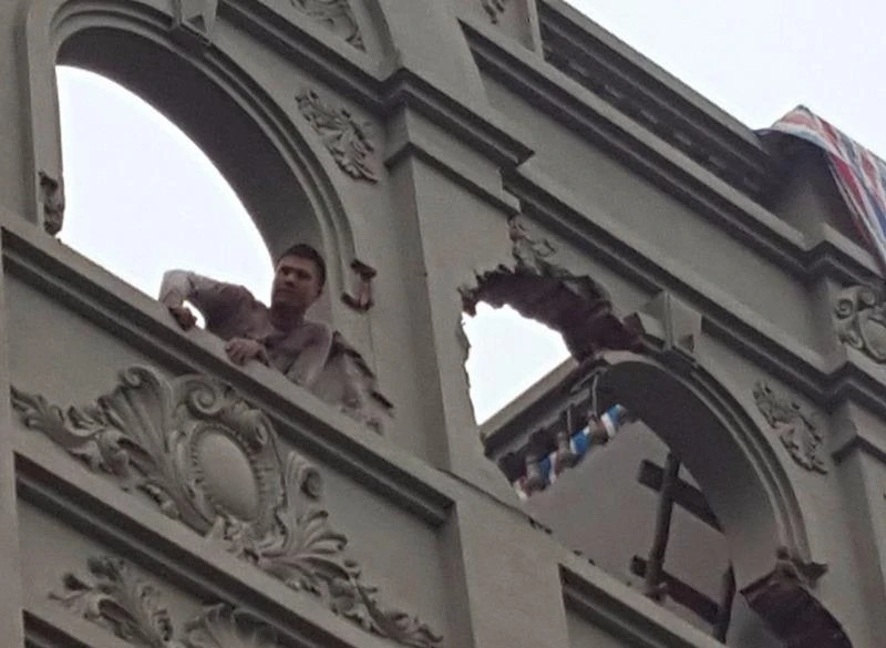 Ghi nhận của PV, một tốp công nhân đã được huy động cùng với khoan, máy phá bê tông tiến hành phá dỡ các bức tường vi phạm. Tuy nhiên, do không có bạt che chắn nên nhiều phần vữa, gạch của bức tường rơi xuống dưới, văng ra đường, khá nguy hiểm.