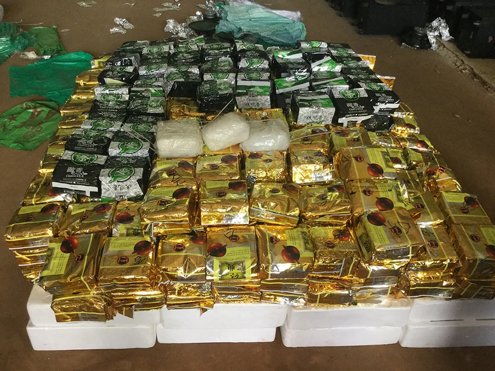 Kiểm tra túi nilon và thùng carton của hai nghi phạm, cảnh sát phát hiện bốn kg ma tuý đá, 0.5 kg Ketamine và 5000 viên thuốc lắc.