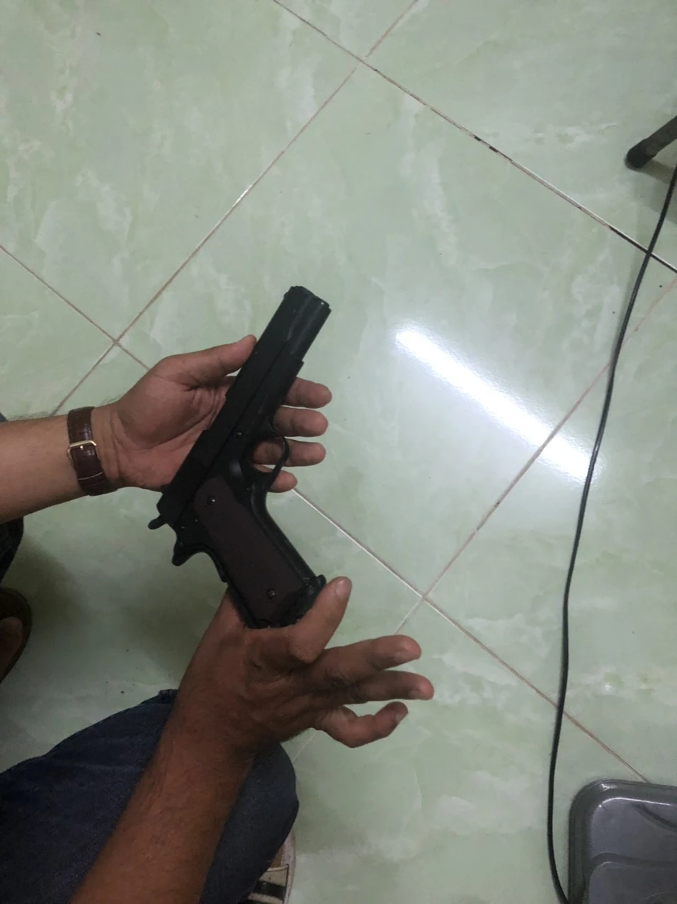 Tiến hành khám xét phòng trọ của Nguyễn công an thu giữ 1 khẩu súng kim loại (loại bắn đạn bi), 1 mã tấu và một số vật dụng phục vụ việc mua bán ma túy.