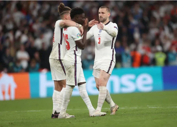 Saka được Phillips và Shaw an ủi. ẢNH: UEFA
