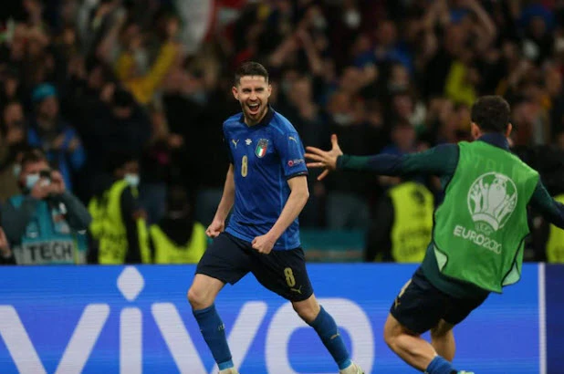 Và Jorginho nhảy chân sáo ghi bàn hoàn thành nhiệm vụ chốt hạ cho người Ý. ẢNH: UEFA