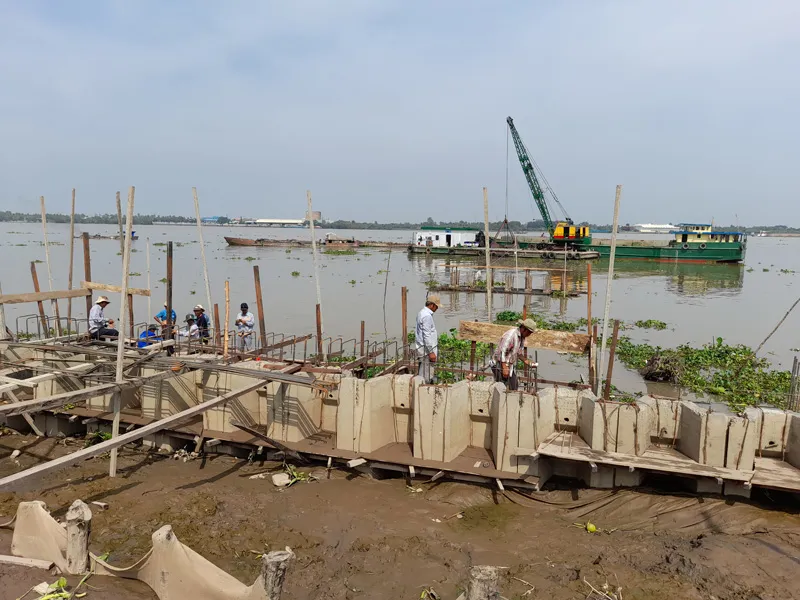 Đang gấp rút thi công bến phà Rạch Miễu tạm. Ảnh: Đ.H