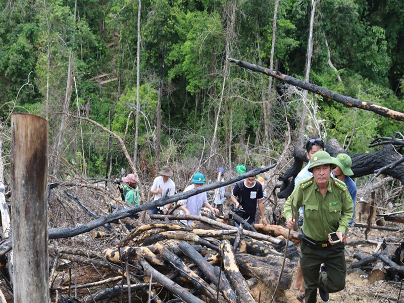 Lực lượng chức năng kiểm tra hiện trường vụ phá rừng. Ảnh: HT