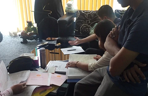 Cơ quan công an đang lấy lời khai các đối tượng liên quan và thu giữ tài liệu tại sàn vàng. Ảnh: TK
