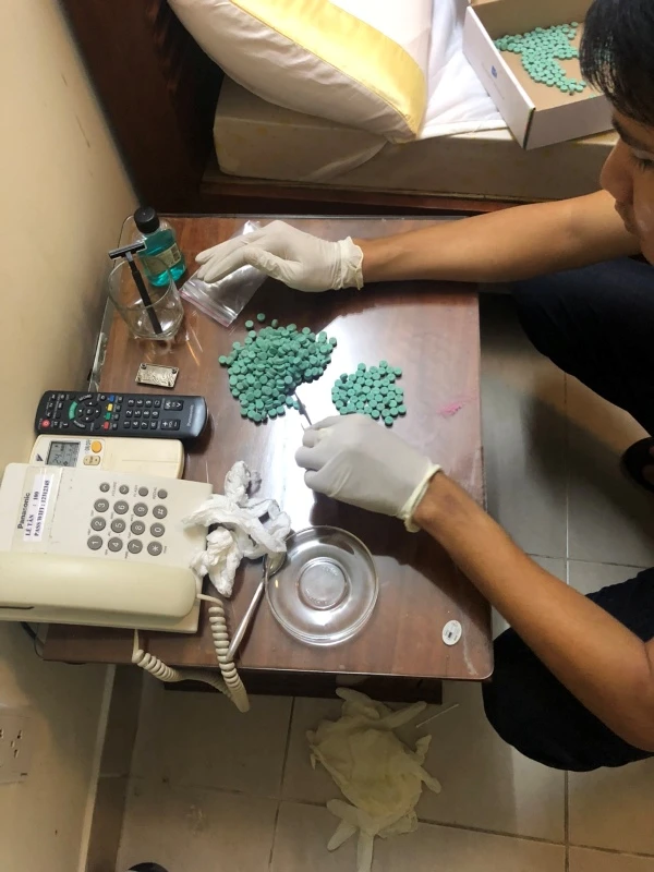 Bước đầu, Minh khai nhận bản thân nghiện ma túy và đang cất giấu một hộp ma túy tổng hợp tại phòng 310 khách sạn (phường 8, quận Gò Vấp).