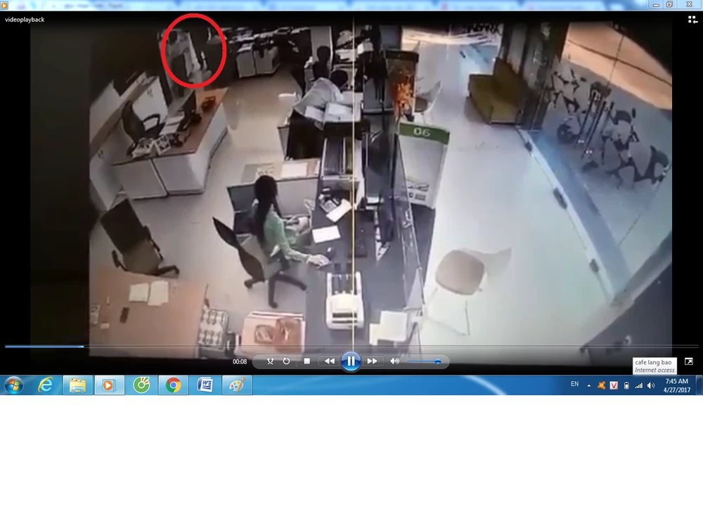 Hình ảnh camera cho thấy 16 giờ 20 ngày 26-4, một kẻ mặc áo khoác trùm đầu, bịt mặt móc súng khống chế sáu nhân viên (ba nữ, ba nam), yêu cầu đưa tiền. Các nhân viên gom tiền bỏ vào túi đưa cho hắn.
