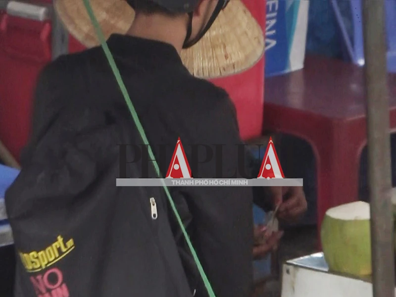 Thanh niên bị bắt xe vi phạm gửi điện thoại tại xe bán nước dừa để lấy tiền đưa cho ông Xuân rồi lấy xe đi. Ảnh: TRƯƠNG NHÂN VĂN