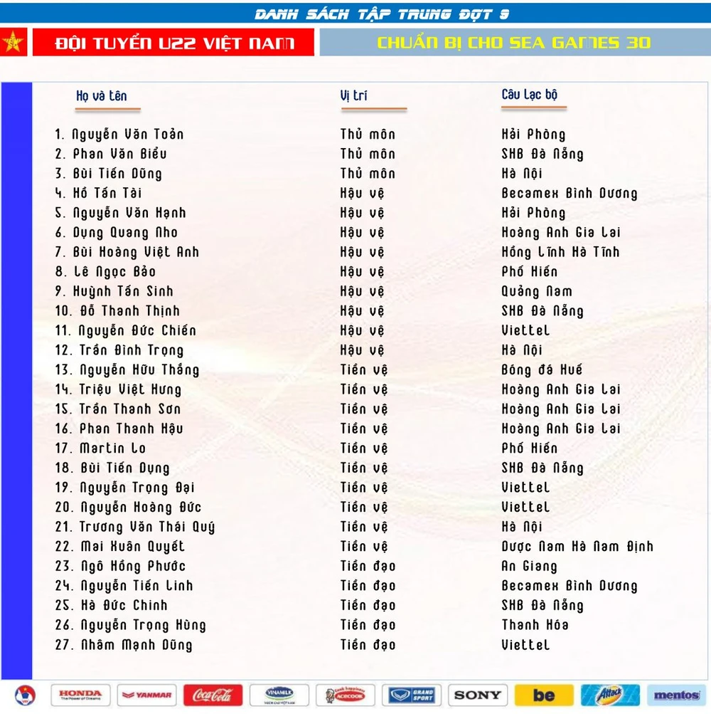 Danh sách 27 tuyển thủ dưới 22 tuổi tập trung chuẩn bị SEA Games 30. Ảnh: VFF.