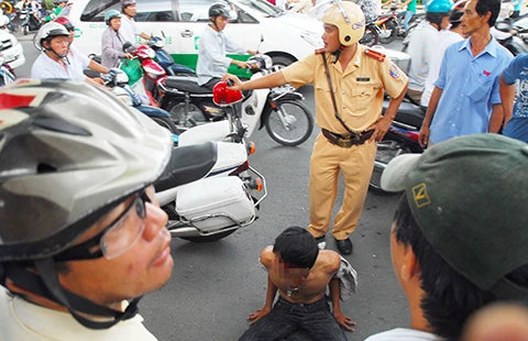 Một đối tượng cướp giật bị người dân và CSGT bắt quả tang trên đường Nguyễn Thị Minh Khai, quận 3, TP.HCM. Ảnh: HTD
