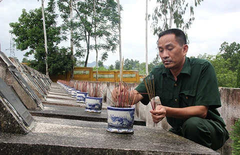 Cựu chiến binh Sư đoàn 356 Lê Huy Tâm, sư đoàn chủ lực ở mặt trận Vị Xuyên (Hà Giang), đang thắp hương cho đồng đội đã nằm lại tại nghĩa trang Vị Xuyên. Ảnh: THANH HÒA