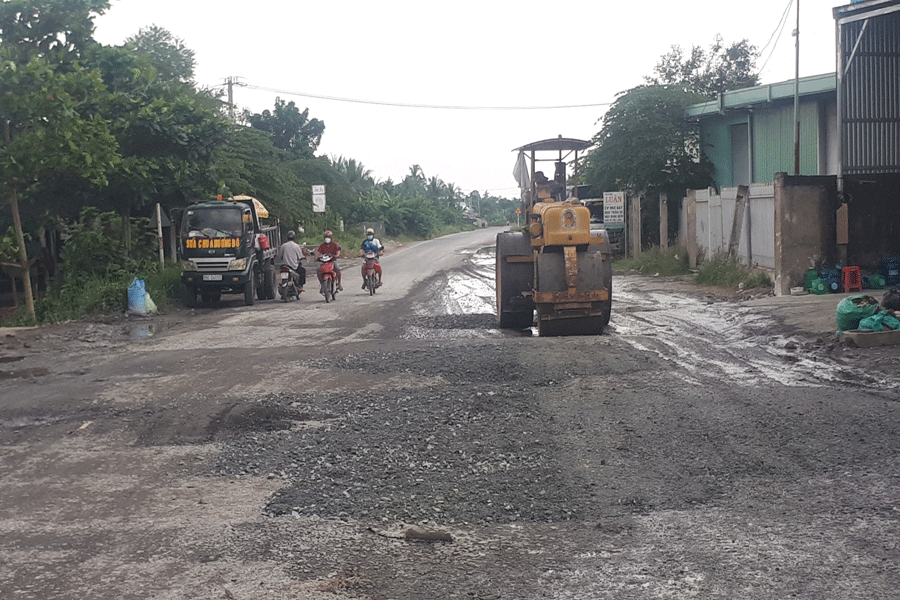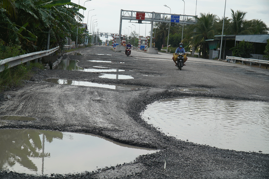 Hư hỏng mặt đường trên tuyến tránh thị xã Cai Lậy (Tiền Giang). Ảnh: PV