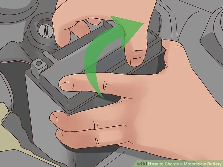 Để tháo pin, trước tiên bạn phải ngắt kết nối cáp âm, sau đó là cáp dương và tiến hành tháo chúng ra khỏi các kết nối của nó với thân xe máy và nhấc nó ra khỏi xe.