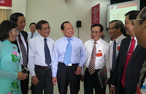 Bí thư Thành ủy TP.HCM Lê Thanh Hải (giữa) trao đổi với các đại biểu tại đại hội. Ảnh: TÁ LÂM