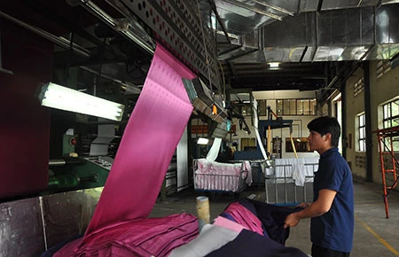 Công nhân chạy máy nhuộm tại Công ty Thái Tuấn. Ảnh: Q.NHƯ