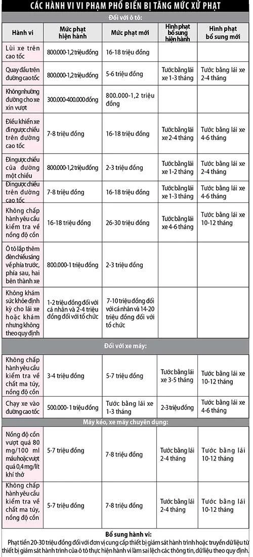 Đặc biệt, người điều khiển ô tô trên đường mà trong cơ thể có chất ma túy được đề nghị tăng mức phạt từ 16-18 triệu đồng, tước bằng lái 22-24 tháng lên 26-30 triệu đồng, tước bằng lái 22-24 tháng.