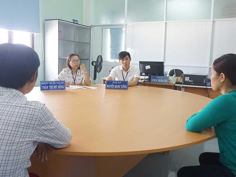 Một phiên hòa giải ở Trung tâm hòa giải- đối thoại tại TAND quận Bình Tân, TP.HCM. Ảnh: NGÂN NGA