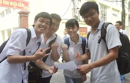 Tỉ lệ đỗ tốt nghiệp cao nhưng dư luận băn khoăn về chất lượng của kỳ thi tốt nghiệp THPT 2014. Trong ảnh: Các thí sinh Hội đồng thi Lê Quý Đôn (Hà Đông, Hà Nội) vui mừng sau buổi thi môn toán. Ảnh: H.HÀ