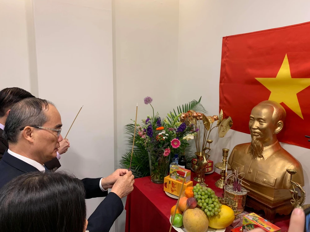 Ủy viên Bộ Chính trị, Bí thư Thành ủy TP.HCM Nguyễn Thiện Nhân và các thành viên của đoàn thắp hương Bác Hồ tại bàn thờ Bác ở Đại sứ quán. Ảnh: ĐỨC HIỂN.