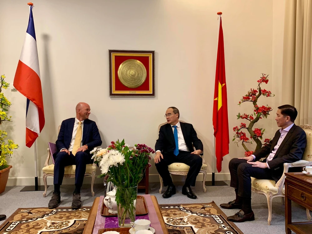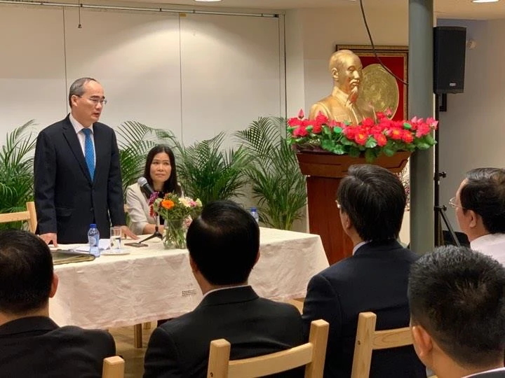 Tại buổi gặp, ông Nhân đã chúc mừng, biểu dương các thành tích hoạt động của Sứ quán. "Mỗi chuyến đi, chúng ta phải trả lời được những câu hỏi mà chính mình đặt ra cho sự phát triển của thành phố, của đất nước", Ủy viên Bộ chính trị, Bí thư Thành ủy TP.HCM Nguyễn Thiện Nhân nói .