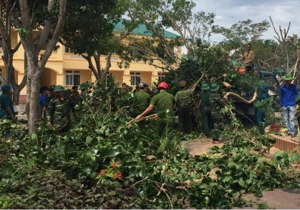 Lực lượng công an, bộ đội, dân quân giúp dân và nhà trường dọn dẹp cây đổ, khắc phục hậu quả bão số 10 ở thị xã Cửa Lò (Nghệ An).