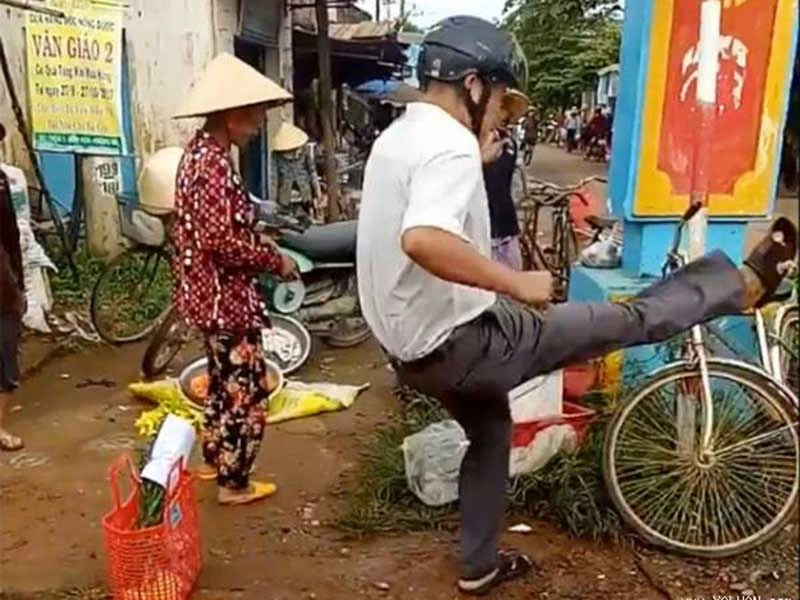 Trưởng Công an xã Quảng Điền liên tục đá văng hàng hóa của nhiều người dân. (Ảnh cắt từ clip)