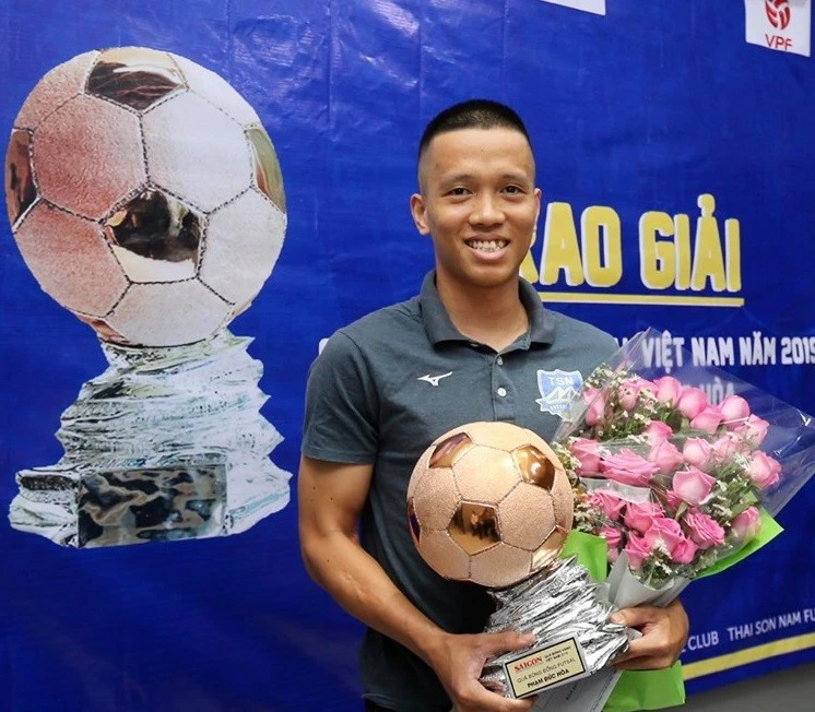 Phạm Đức Hòa hạnh phúc với Quả bóng đồng Việt Nam 2019. Ảnh: ANH PHƯƠNG.