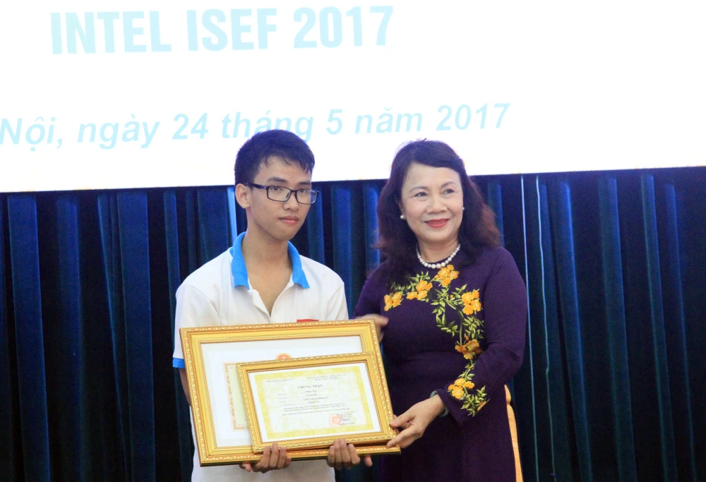 Phạm Huy trong buổi lễ đón và trao giải cho đoàn học sinh Việt Nam tham dự Hội thi Khoa học kỹ thuật Quốc tế Intel ISEF 2017 tại Mỹ.