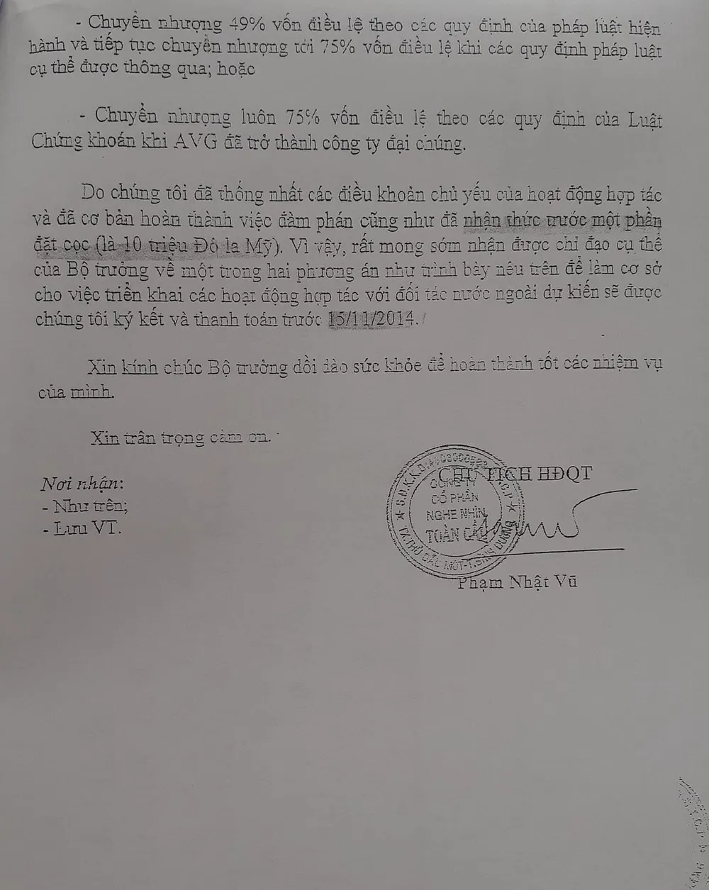 Phạm Nhật Vũ gửi văn bản cho ông Son "nổ" về đối tác nước ngoài mua AVG với giá 700 triệu USD. ẢNH: N.ĐỨC