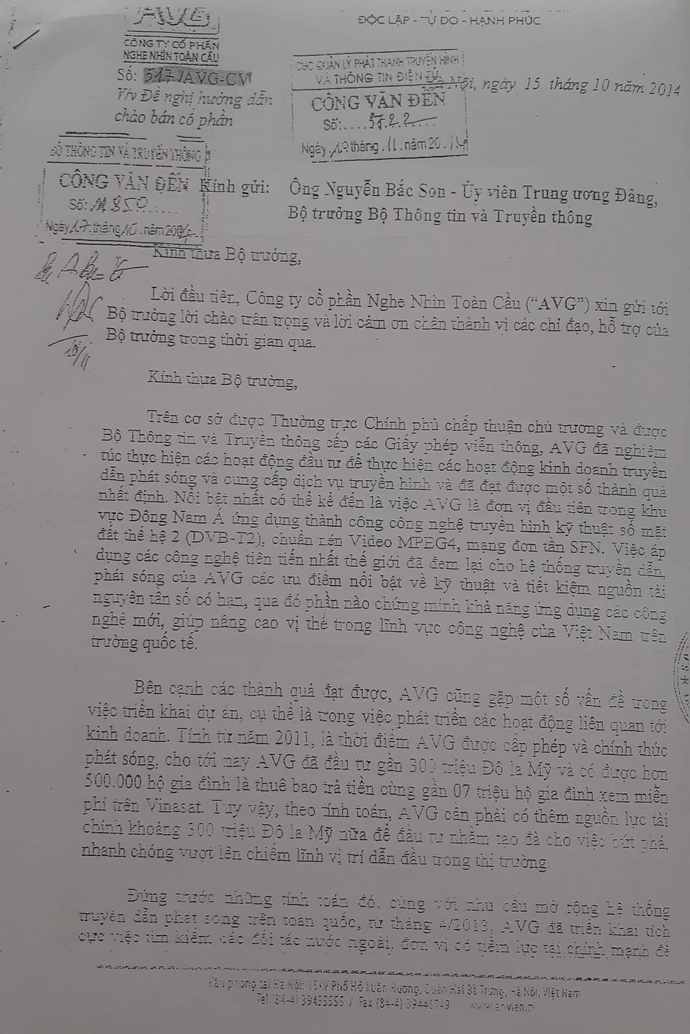 Ông Vũ cũng thông báo đã nhận đặt cọc 10 triệu USD từ “đối tác nước ngoài” này. Sau khi nhận được công văn từ AVG, ông Son đã bút phê giao cho các vụ chức năng của Bộ TT&TT khi đó xem xét, thẩm định để trình Ban cán sự đảng Bộ TT&TT quán triệt.