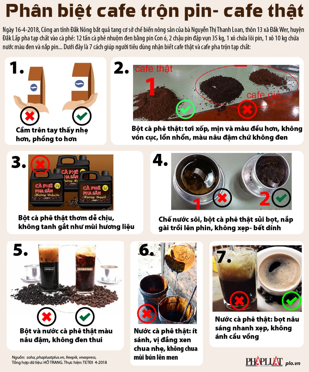 (PLO)- Ngày 16-4, Công an tỉnh Đắk Nông bắt quả tang cơ sở chế biến nông sản của bà Nguyễn Thị Thanh Loan, thôn 13 xã Đắk Wer, huyện Đắk R'lấp pha tạp chất vào cà phê: 12 tấn cà phê nhuộm đen bằng pin Con Ó, hai chậu pin đập vụn 35 kg, một xô chứa lõi pin, một xô 10 kg chứa nước màu đen và nắp pin... Dưới đây là bảy cách giúp người tiêu dùng nhận biết cà phê thật và cà phê pha trộn tạp chất: