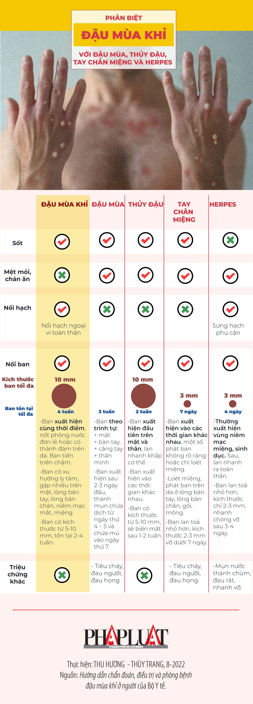 (PLO)- Giai đoạn bệnh đậu mùa khỉ toàn phát có biểu hiện phổ biến là sự xuất hiện của các ban trên da, thường gặp sau sốt từ 1-3 ngày. Tình trạng này cũng gặp ở một số căn bệnh khác như chân tay miệng, thủy đậu, herpes lan tỏa, đậu mùa. Do đó, Bộ Y tế đã chỉ ra cách phân biệt như sau: