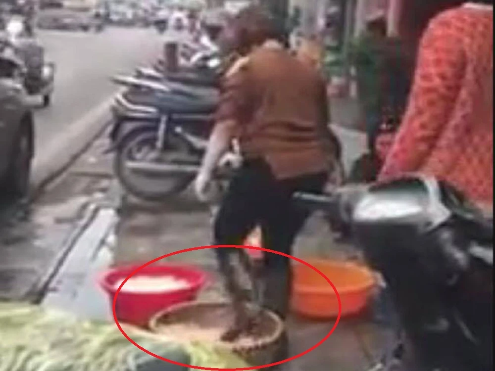 Do thời điểm xảy ra vụ việc là khi lực lượng công an ra quân dẹp vỉa hè, một nhân viên của quán đã đổ chậu nước và lòng heo vào thúng để mang vào nhà. Tuy nhiên, do lòng đầy nước và không thoát ra được, nhân viên này không biết làm thế nào nên đã dùng chân khoắng cho nhanh hết nước.