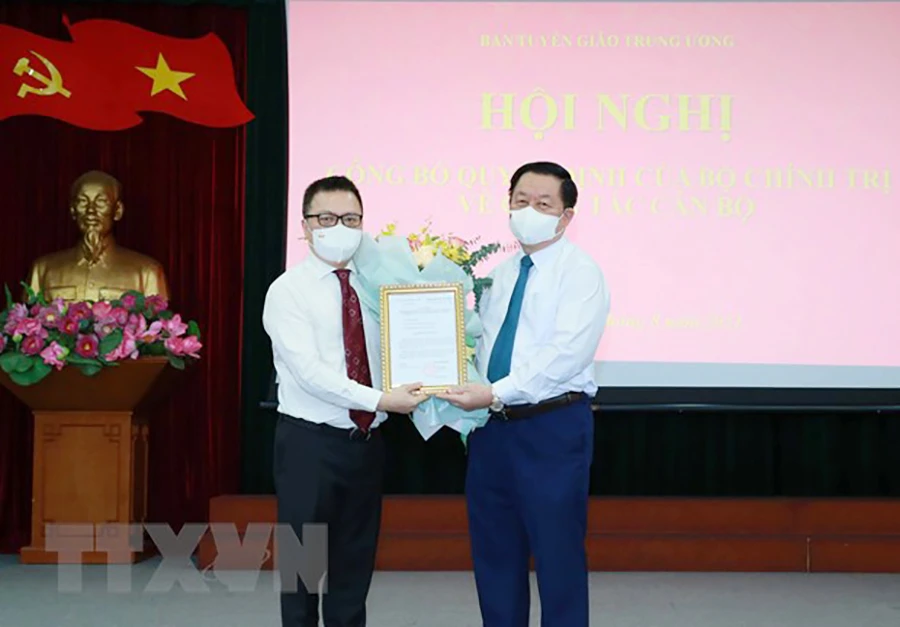 Bí thư Trung ương Đảng, Trưởng Ban Tuyên giáo Trung ương Nguyễn Trọng Nghĩa trao quyết định Phó Trưởng Ban Tuyên giáo Trung ương cho ông Lê Quốc Minh. Ảnh: TTXVN