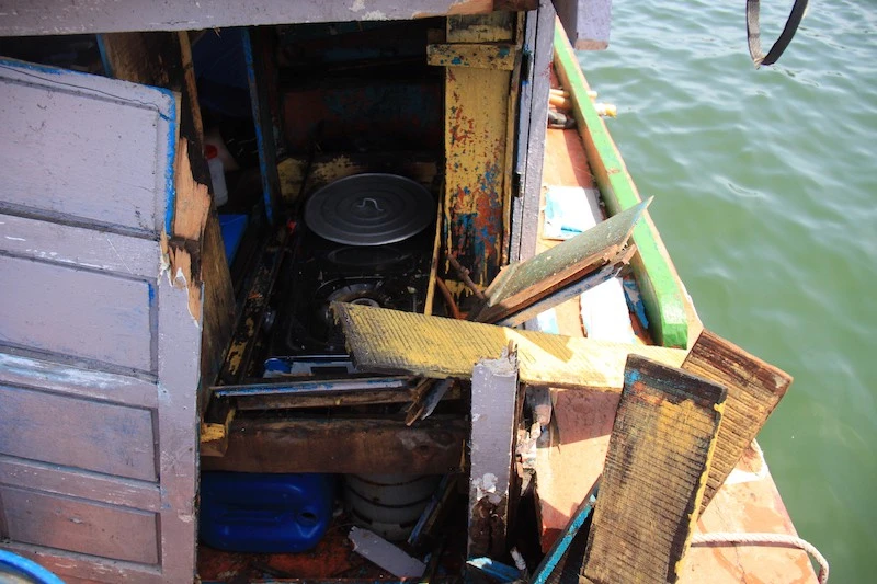 Tàu của ngư dân hư hỏng do bị tấn công. Ảnh: TN