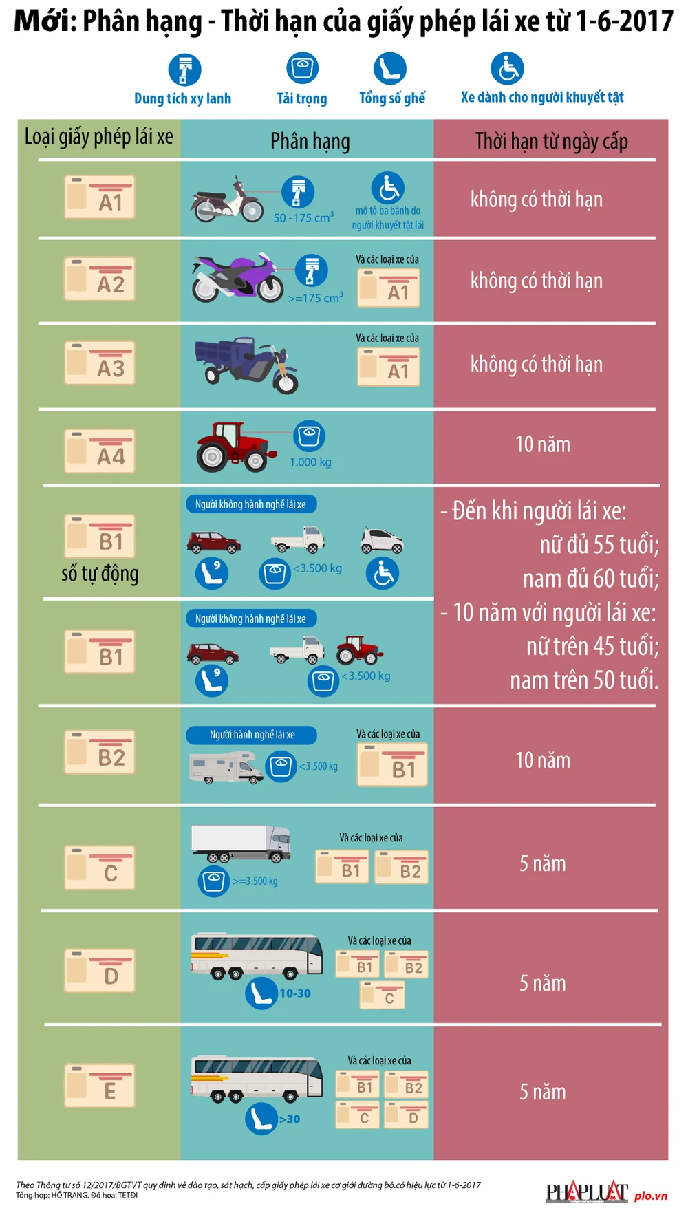 Phân hạng, thời hạn giấy phép lái xe từ 1-6-2017