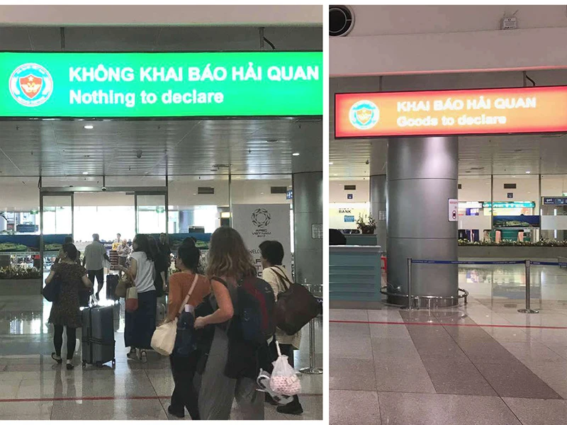 Cụ thể, tại khu vực ga đến quốc tế, có hai cửa treo bảng điện tử hướng dẫn màu xanh - “cửa xanh” (không phải khai báo hải quan - Nothing to declare) và hai cửa treo bảng điện tử hướng dẫn màu đỏ - “cửa đỏ” (phải khai báo hải quan - Goods to declare).