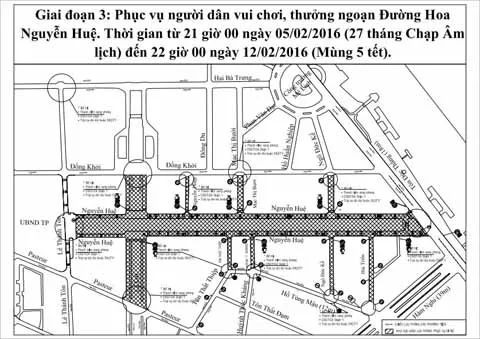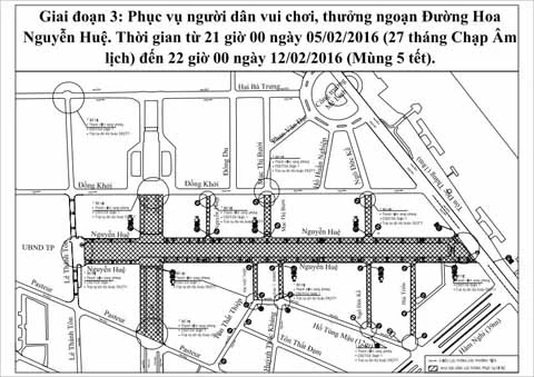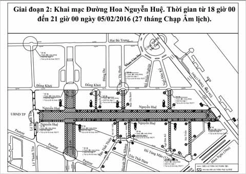 Từ 19 giờ ngày 5 đến 22 giờ ngày 12-2-2016 (tức từ 27 đến mùng 5 tết) là thời gian mở cửa đường hoa Nguyễn Huệ tết 2016. Trong thời gian này, cấm tất cả phương tiện lưu thông ở những tuyến (đoạn) đường sau: Đường Nguyễn Huệ (đoạn từ đường Lê Thánh Tôn đến đường Tôn Đức Thắng), đường Lê Lợi (đoạn từ Pasteur đến Đồng Khởi), đường Nguyễn Thiệp (từ Nguyễn Huệ đến Đồng Khởi), đường Tôn Thất Hiệp (đoạn từ Nguyễn Huệ đến Hồ Tùng Mậu).